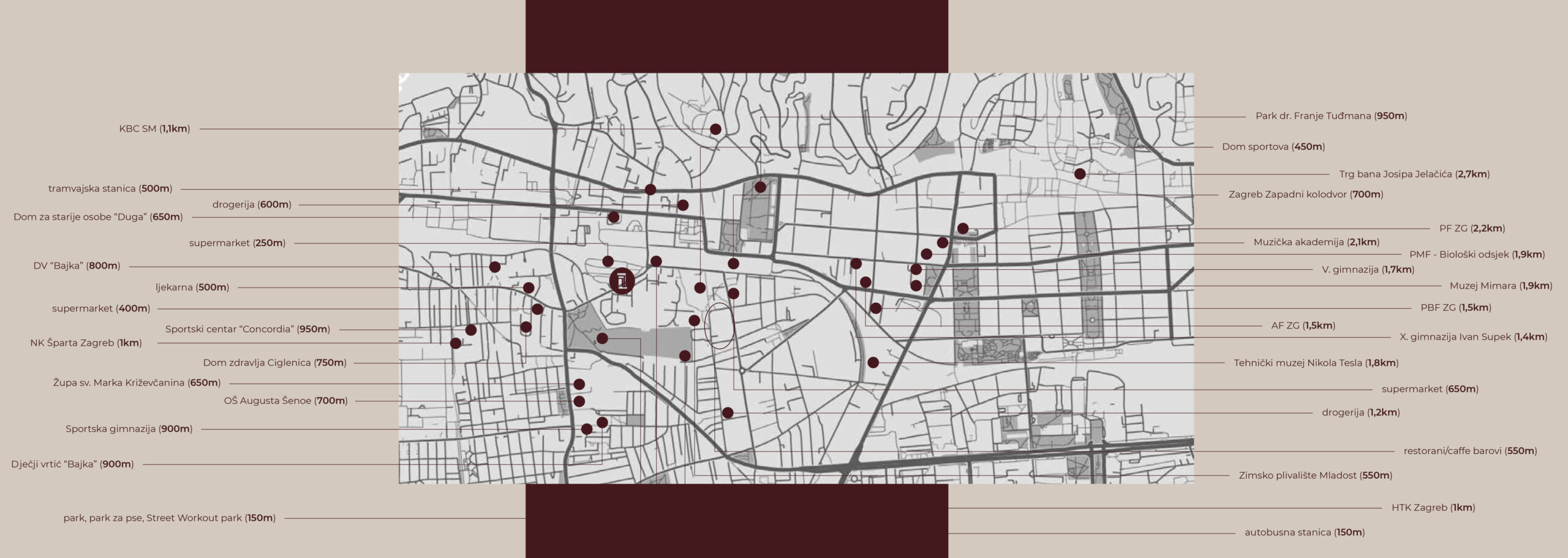 Projekt LATERRA smješten je na izuzetno prometno povezanoj lokaciji koja omogućuje brz i jednostavan pristup svim dijelovima grada. U neposrednoj blizini nalaze se tramvajska i autobusna stajališta, što vam omogućuje praktično i brzo putovanje javnim prijevozom. Za one koji koriste osobni automobil, glavne gradske prometnice i obilaznice udaljene su svega nekoliko minuta vožnje.